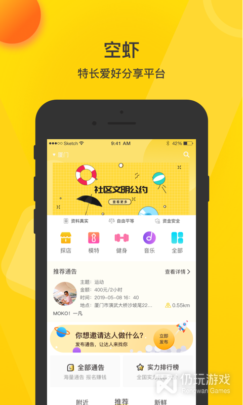 1、在空虾中可以对自己的特长和技能对外分享,实时发送生活动态,快速搜索来让大家都可以看到你不一样的一面,海量用户为您点赞,评论,享受青春