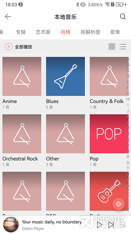 3. 支持全部歌曲、文件夹、专辑、艺术家、风格分类,在歌曲浏览列表中可添加到播放队列、查看歌曲信息等;