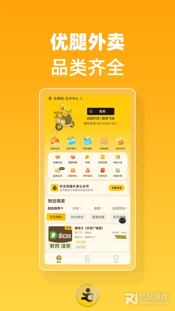 1、优腿外卖,跑得飞快,保证让您下单后立刻就能享受到美食。为您带来身边的美食资源,除了外卖外,水果,生鲜,超市,日用都可以在这里帮您选购,让您足不出户就能享受快速的送货上门体验