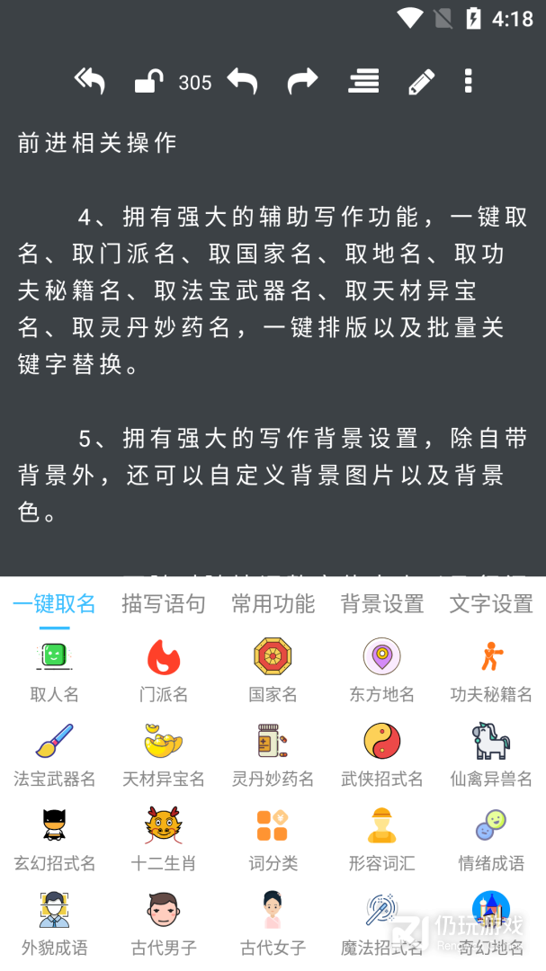 4、拥有强大的辅助写作功能,一键取名、取门派名、取国家名、去地名、取功夫秘籍名、取法宝武器名、取天材异宝名、取灵丹妙药名,以及批量关键字替换。