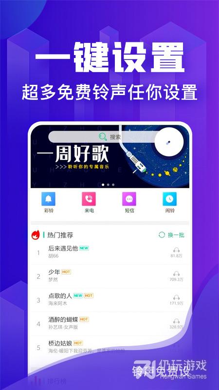 3、让用户能够在这里找到各种想听的歌,一键轻松设置为铃声,非常的便捷