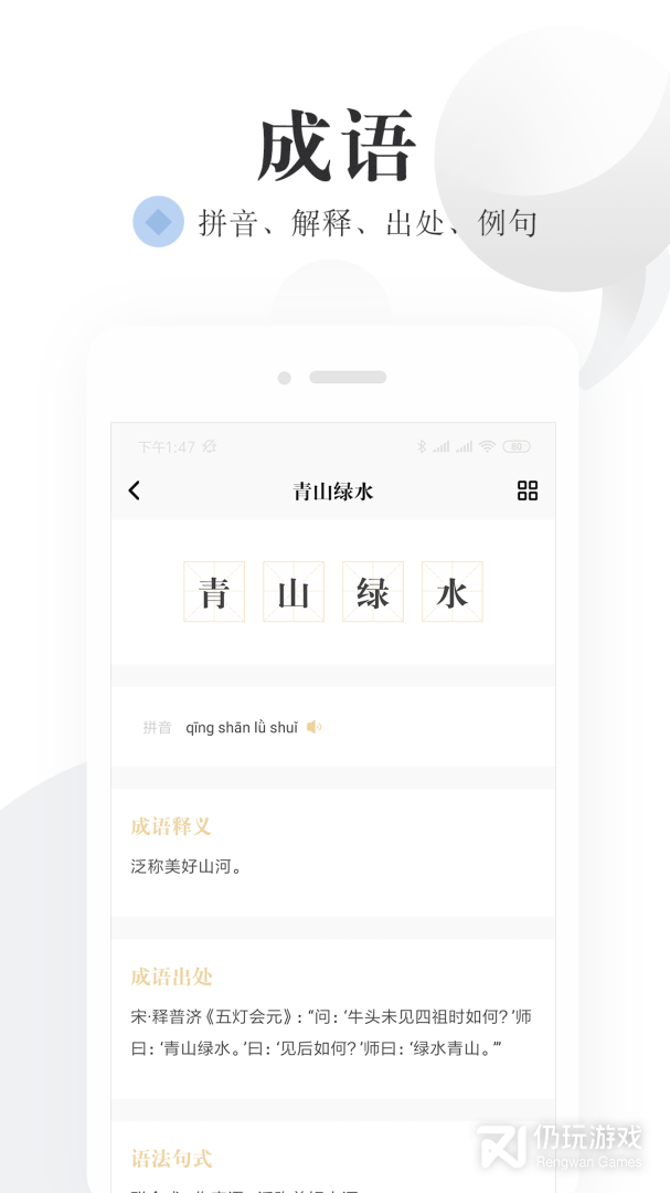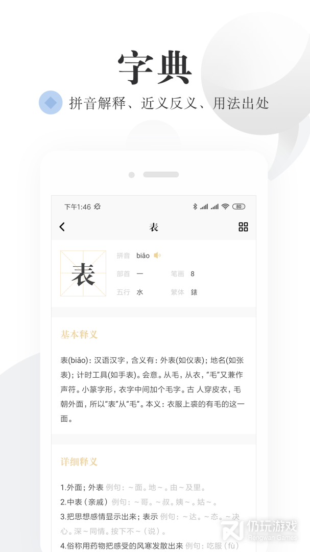 每个字和词都有解释、提供例句、语法解析、多角度学习词语;包括拼音、部首、同义反义、出处、详解等实用功能!