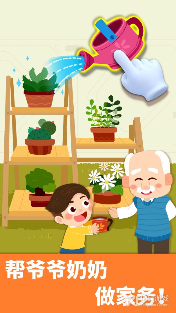 爷爷的盆栽需要打理了。宝宝和爷爷一起修剪、拔草、浇水,为植物喷上营养液。