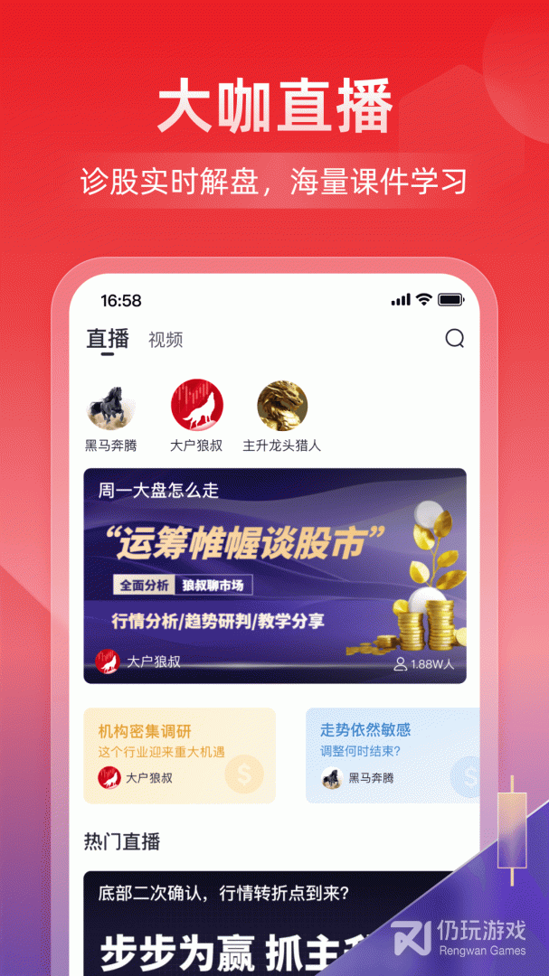 ·专业的投顾、投资达人实时进行直播,为你提供诸多的投资战法、进行实时诊股