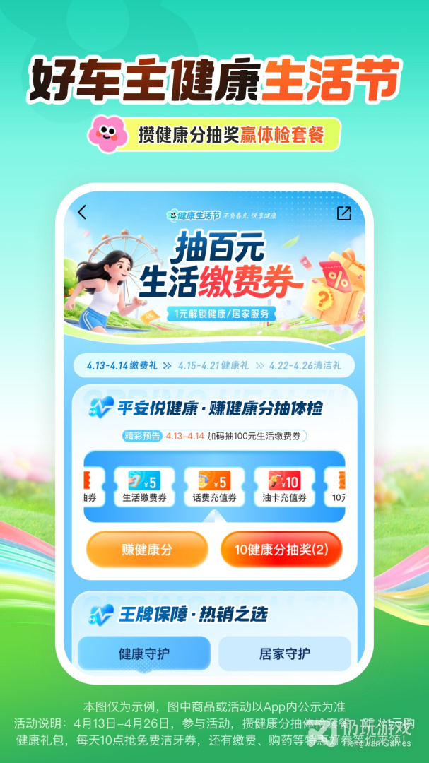 3、【健康生活节】:4月13日-4月26日,进入好车主健康生活节活动页,攒健康分抽奖赢体检套餐,新人1元购健康礼包,每天10点抢超声波洁牙等免费券,还有50减25元生活缴费券、20元购药券可领,更多购药、衣鞋清洗、家电清洁、生活缴费等特惠好券,等你解锁!