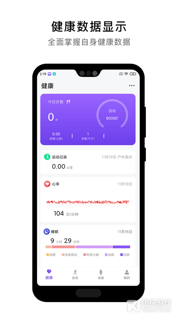 3、健康数据显示:记录步数、睡眠、心率、体重、血氧等身体状态数据