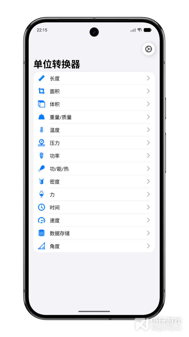 支持14种常用单位换算:长度,面积,体积,质量,温度,压力,功率,功/能/热,密度,力,时间,速度,数据存储,角度