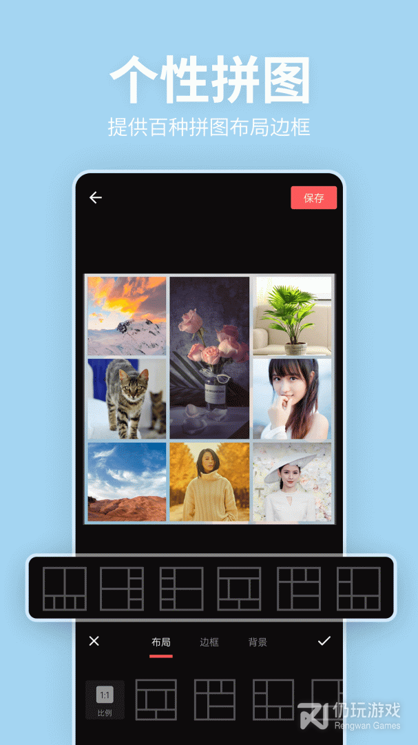 6、丰富的特色拼图模板,平台模板中设置了各种不同形状大小的宫格平台,还有翻转类的拼图,另外设置特色调整工具