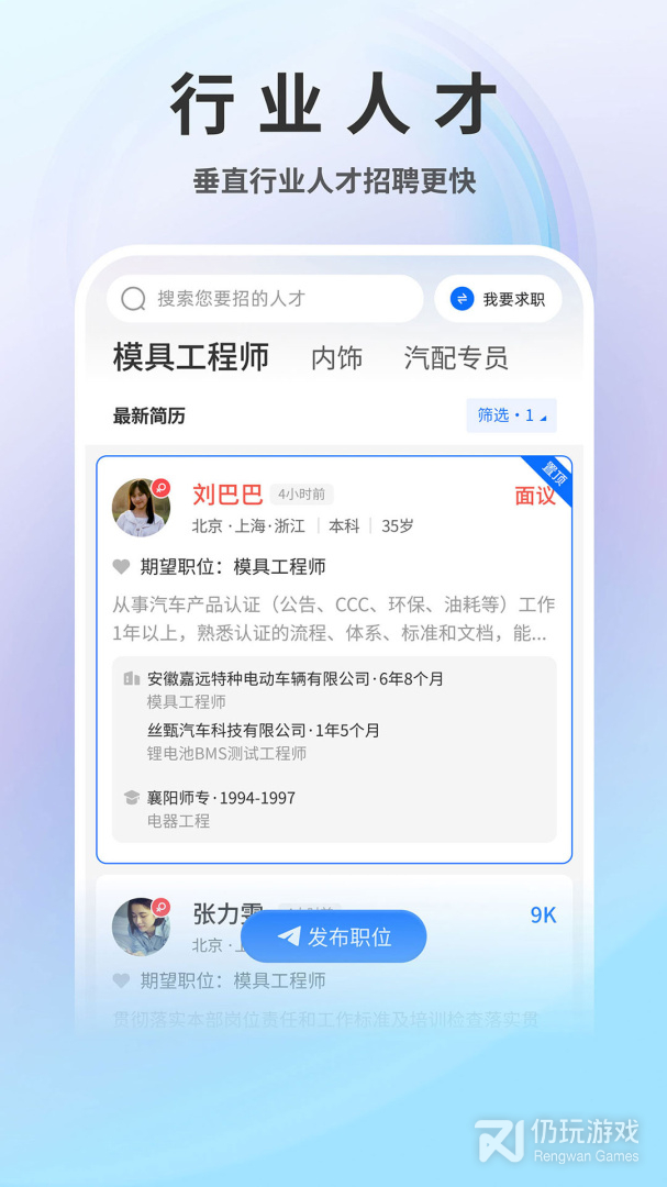 2、中国汽车人才网App是面向于汽车行业的求职招聘服务平台,权威审核每一条招聘信息,聚合全国各地的招聘信息,用户可以极速筛选钟意的工作岗位,行业工作岗位全面覆盖,可满足不同用户的求职需求,在线一键批量投递简历,响应极速,汽车行业求职必备