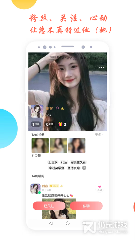 2、倾心交友,邂逅心动对象,分享个人生活,找到真正懂自己的人,随时随地在线互动,放心交友,为用户带来更安全、更便捷的交友服务,发布动态,认识更多新朋友