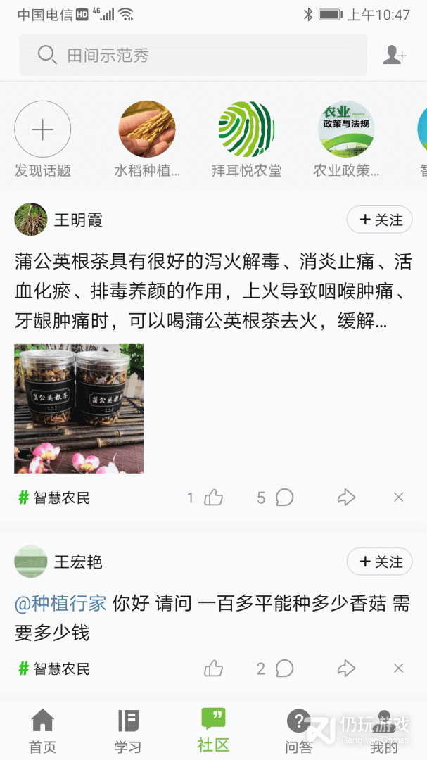 社区板块拥有《村品集市》、《休闲农业》、《畜禽养殖》、《柑橘种植日记》多个品牌话题圈子,每天贡献话题数超过2000余条,有效解决了农品产销难的问题。