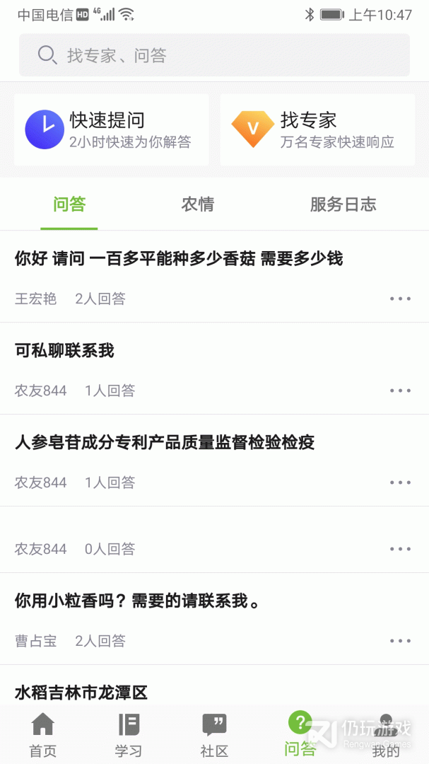 问答板块中,农民朋友可以将农业生产中遇到的技术问题以文字、图片等方式提交给平台,平台推送到农技人员、农业专家手机APP中。目前,在线解答农民提出的生产技术问题150多万条。