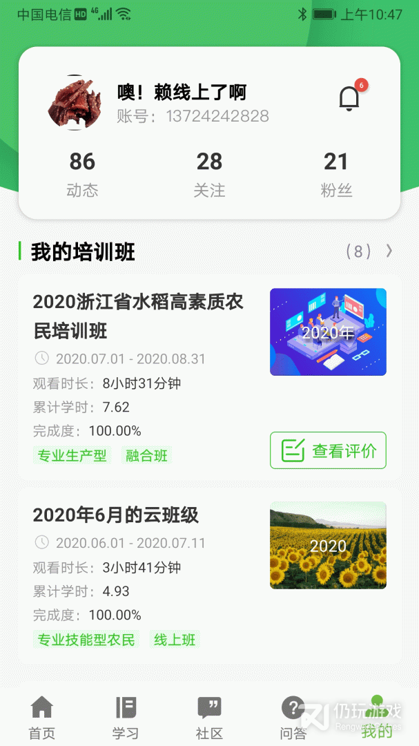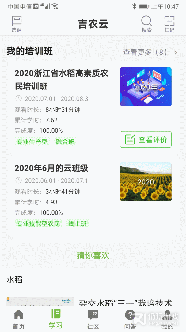 吉农云是一个涉及到农业相关资讯的平台,主要为用户提供农业技术学习以及社区讨论等功能;可以在首页看到其中的直播、田间示范秀以及科技推广类的各种资讯信息资源,从中找到感兴趣或想要学习的类型切换查看;主功能栏专门设置了学习中心,里面展示我的培训班记录内容,可以点击进入培训班中查看详情,从该培训班封面可以看到观看的时长、累计学时以及完成度的数据信息,这些信息展示了自己是否已经完成该班级学习任务;在学习中心还会根据当前学习的课程类型推荐猜你喜欢的课程资源,学完后立即能从中挑选另外知识继续学习。