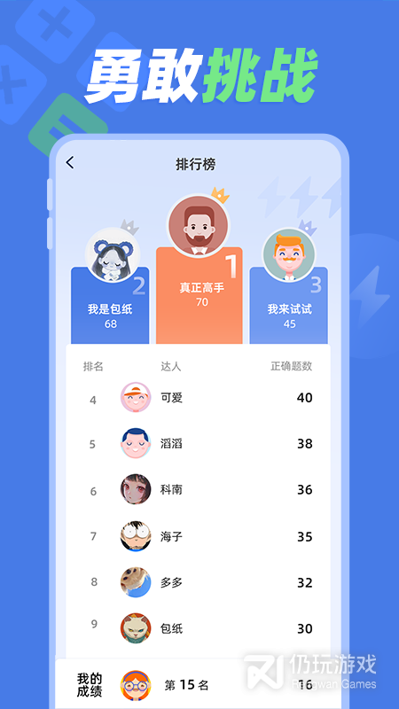 看看再规定时间内,谁能答对更多的题,该模块设置了排行榜,用户可以看看自己的计算水平排在什么位置。