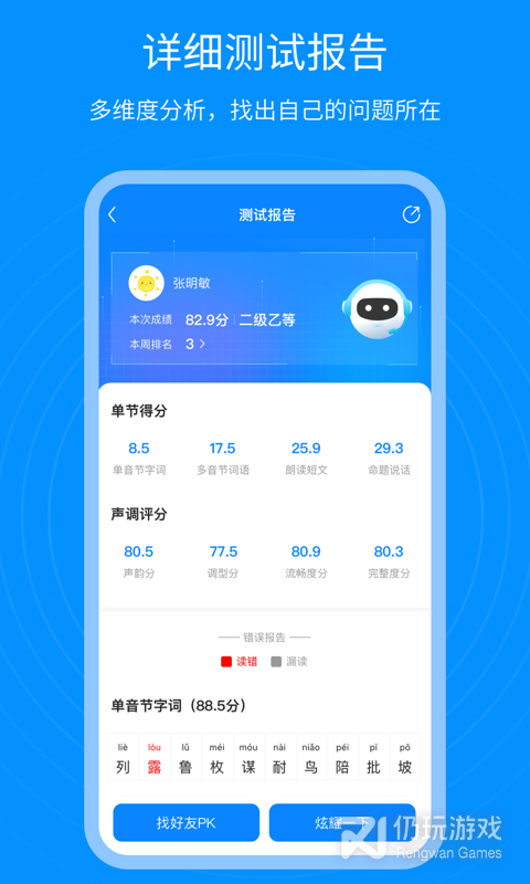 3、软件采用先进人工智能测评技术,对你的普通话发音进行评分,帮你找出错误发音。针对性纠正,有效提高普通话水平