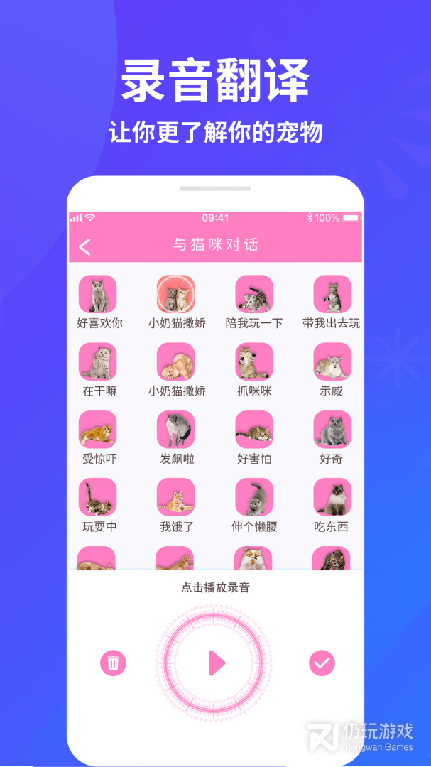 3、与猫交流,点击各种猫的头像有不同的场境对话,也可以翻译您讲的话给猫听。