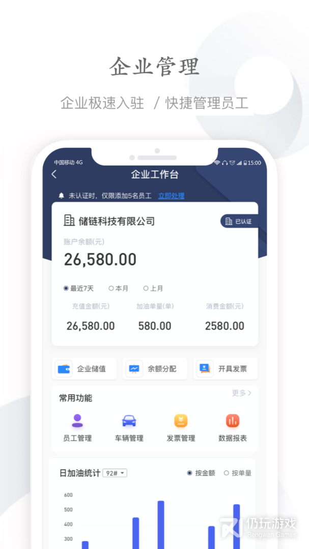 3、而且可以方便广大企业直接入住,随时手机管理自己的企业员工,每天加油情况自动统计。