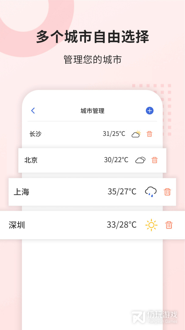 3、便捷城市管理,长按删除城市,简约操作一步到位