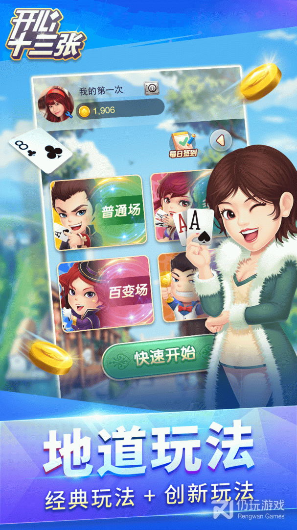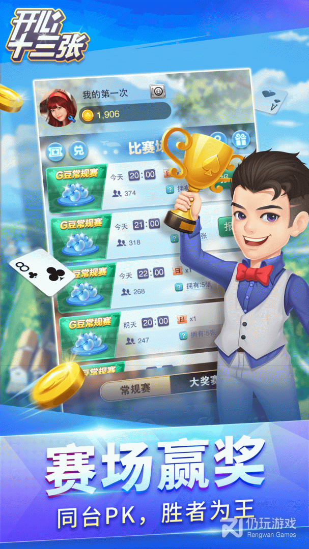 3、十三张,又称十三水、十三道、罗宋等,是颇为流行的扑克游戏!开心十三张手机游戏让你在手机上也能玩到,真人扑克对战,在地道十三张玩法上再加以创新,万人在线同台PK,还有同城赛场,胜者为王
