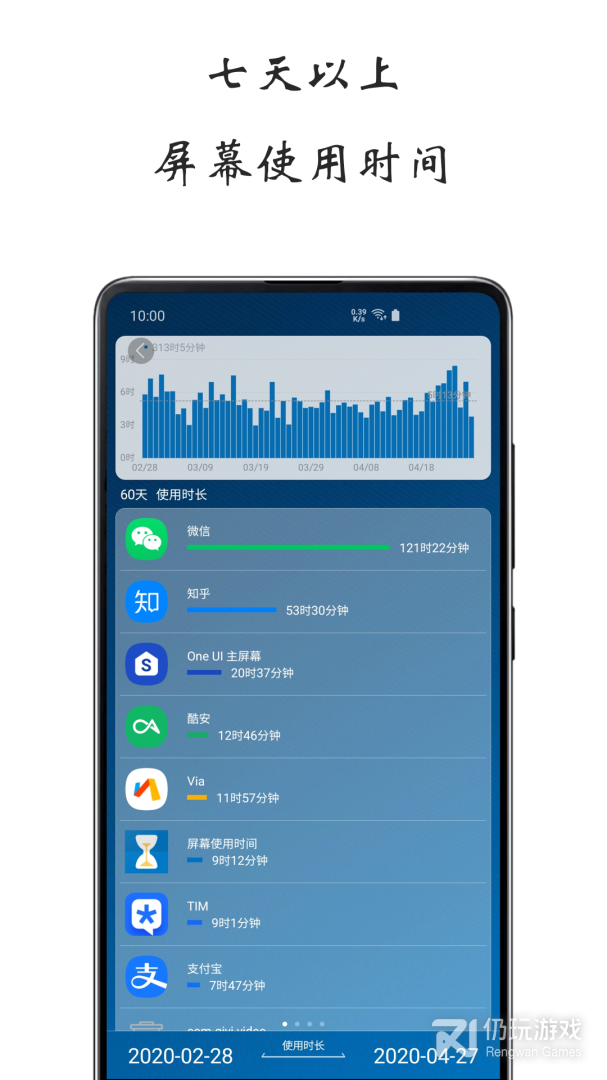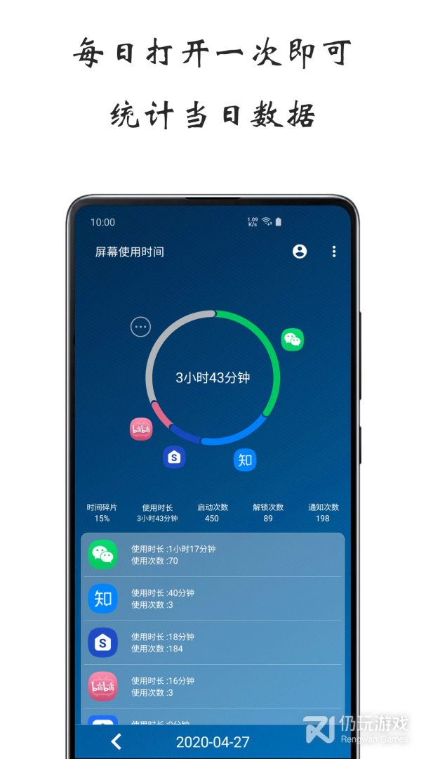 1、近期的统计数据来看,我国已经有了8亿多的网民,而手机的占用量也可想而知,有很多现在每天的活动就是抱着手机,减少手机的实用或者减少手机当中APP的实用,这款软件能够让你了解你在一周当中屏幕具体实用时间