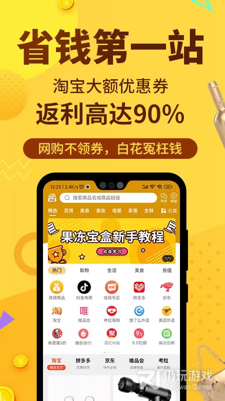 1、果冻宝盒,让你省钱返利购物神器。在果冻宝盒中你可免费领取淘宝天猫的内部优惠券,参与限时抢购活动,以及邀好友赚奖励等
