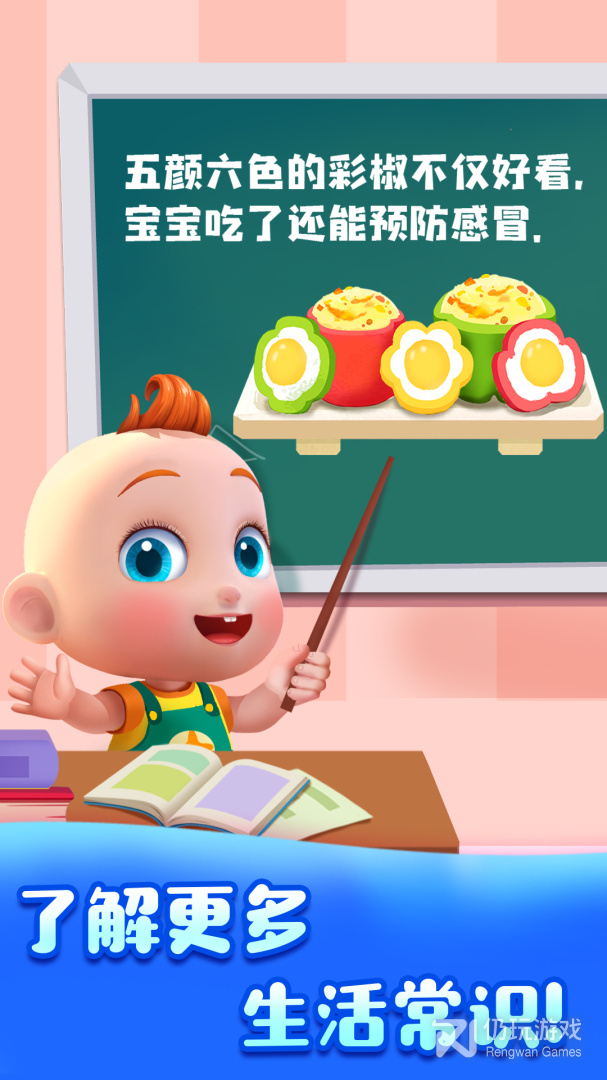 宝宝爱吃的美味菜肴怎么做呢?首先,需要备好食材哦。先来做个彩椒煎蛋吧:鸡蛋、盐、火腿……这里瞧瞧,那里看看,少了点什么呢?原来小彩椒们藏起来了!宝宝去烹饪厨具的附近,找一找调皮的彩椒吧。