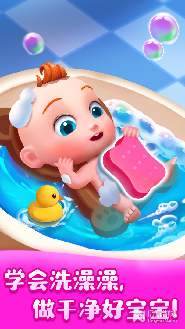 旋转出水按钮,先来调个水温,热气腾腾的浴室可真舒服啊。放上宝宝专用的小熊网兜,带好可爱的浴帽,挤上小鸭子沐浴露。搓搓小手,再刷刷小脚,冲掉泡泡,宝宝变得真干净。