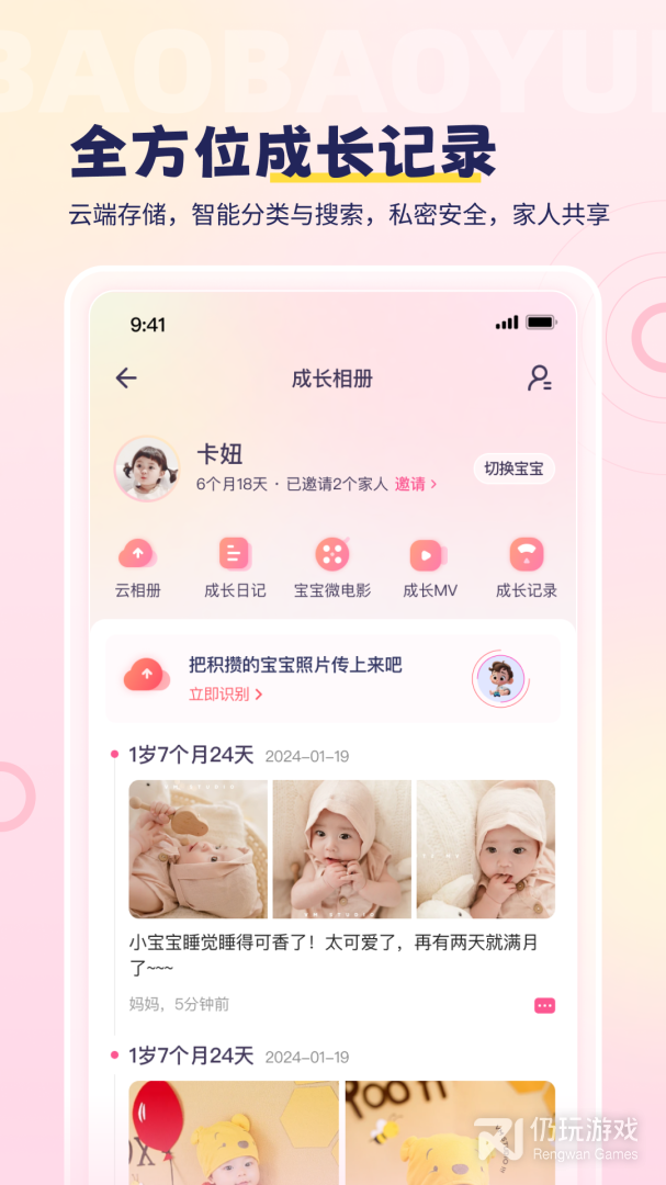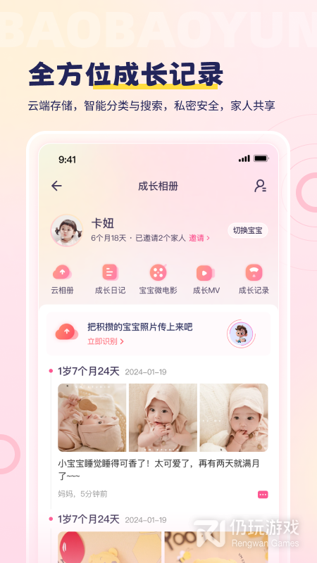 2、在宝宝云APP上从宝宝出生那一刻就可以建立宝宝档案,记录下很多图片和影像,爸爸妈妈们可以吧宝宝的日常生活全部记录下来