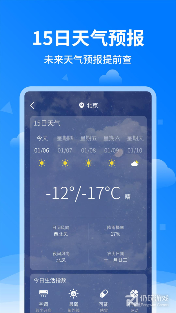 2、根据当日天气状况提供相应的生活建议:紫外线、钓鱼指数、穿衣指数、洗车指数、感冒指数、运动指数、旅游指数等,助您生活旅游、穿衣洗车钓鱼通掌握。