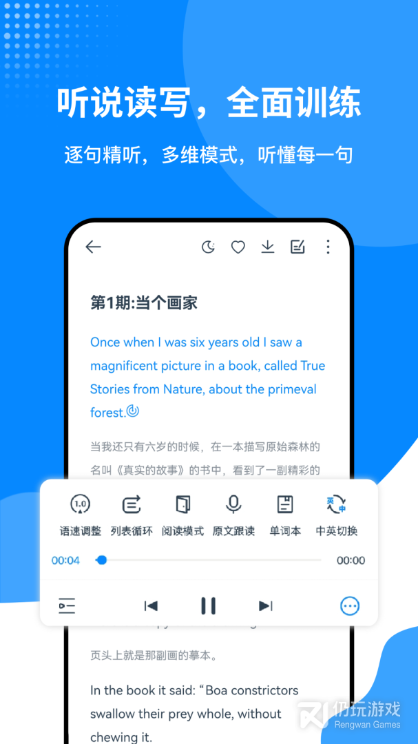 4、口语跟读:智能实时口语评分,逐句跟读逐词打分,助你攻克"开口”难关;