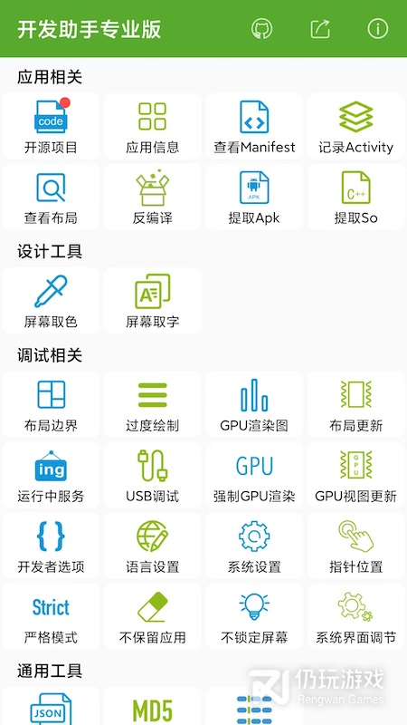 1、能够用来快速调试应用以及查看手机软硬件相关信息,能够用来快速查看activity历史记录、查看应用manifest、提取应用apk文件、反编译app、调试应用、查看手机软硬件信息等,后续会添加更多功能