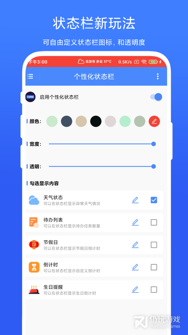 3.如:某个地市的天气情况、最近待办内容、节假日倒计时、重要事情倒计时、生日提醒等。另外,软件还支持设置状态栏颜色、透明度、宽度等参数。