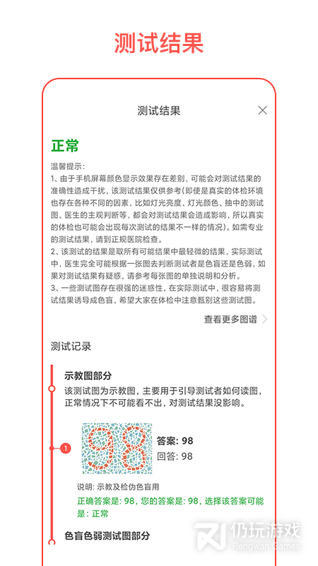 选取特定图谱,按顺序浏览图谱和答案。通过色盲滤镜还原图谱真相。