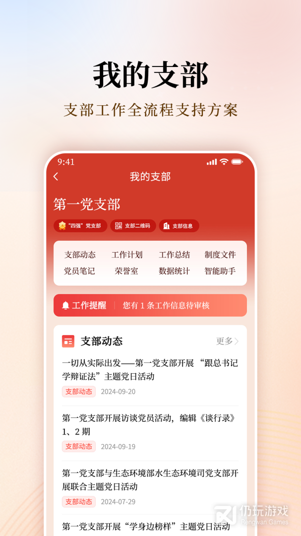 3、支部工作,很棒的学习工作平台,具有高效的服务和选择,手机上的呈现和使用都是不错的,您可以更加全面的认识关于党建知识的认识,随时都能打开来进行完善的