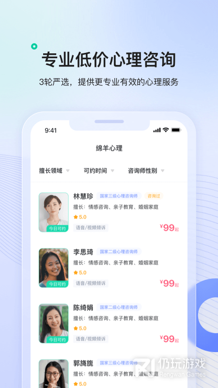 1、绵羊心理app会根据执业资格、培训经历、个人素质等方面对每位入驻的心理咨询师展开全方位的评估筛选,只有通过平台检验后方可提供心理服务。同时会对咨询中的文字、视频、语音进行安全加密,保护双方的隐私和权益