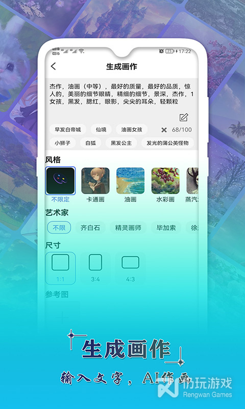 2、ai辅助绘画是款文字生成画作的AI绘画生成器,输入文字,AI作画,版权属于用户。软件提供了许多选项供用户选择,画作风格、艺术家、尺寸等,每种搭配都可以生成不同风格的画作哦,可以在线切换,直至生成自己满意的作品。软件还支持导入图生成画作,以图片为母版,生成相似度极高的绘画作品