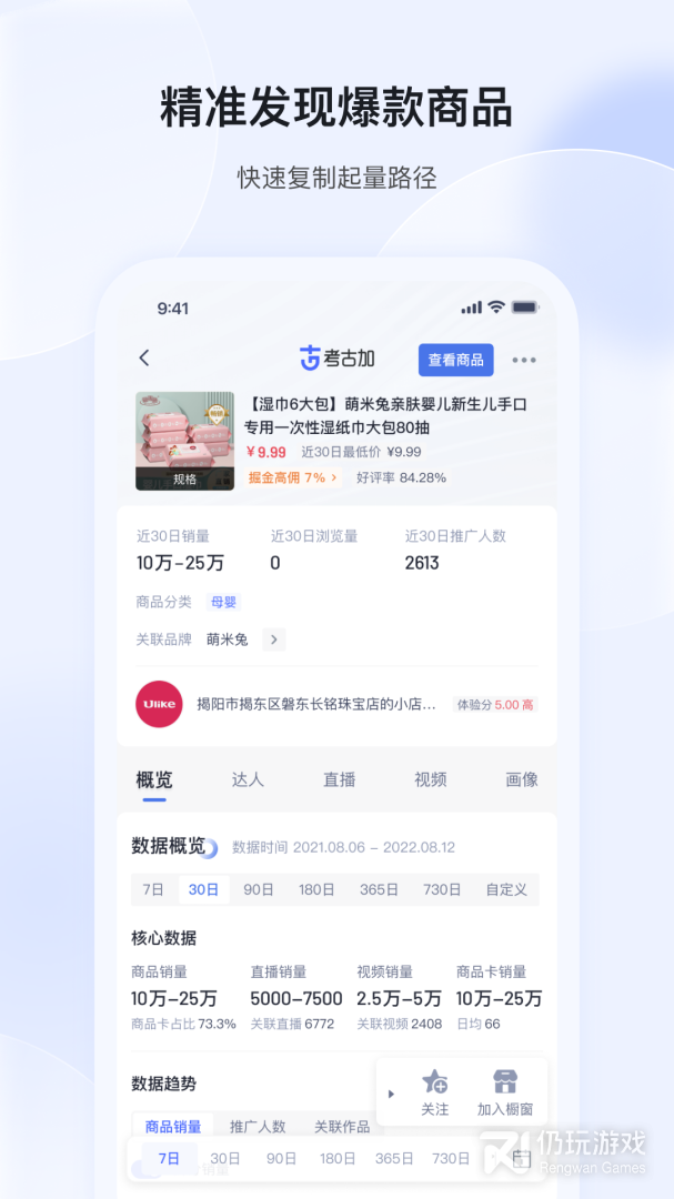 1、考古加,电商带货必备的数据分析平台,具备强大的数据分析功能,获取详细数据,智能分析,让广大电商轻松掌握带货情况