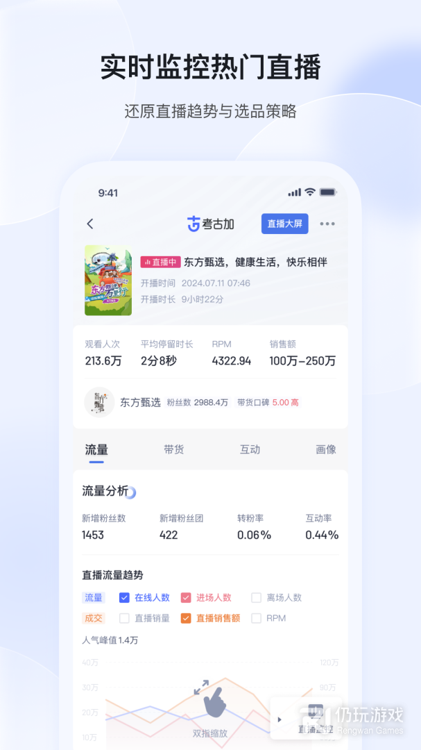 2、直播同步监测流量数据、带货趋势等详细的重要指标