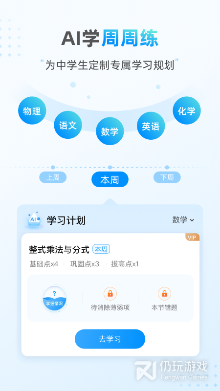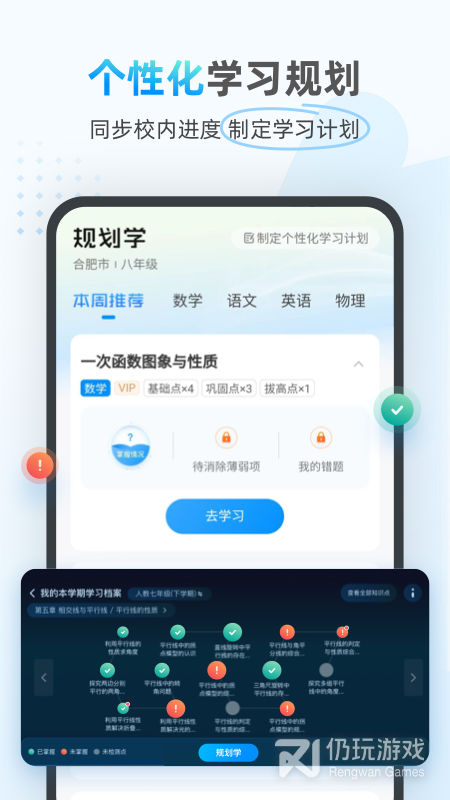 2、小鹰爱学为你定制专属学习计划,每周推荐学习内容,通过个性化诊、学、练、测四大环节,帮助你科学高效学习