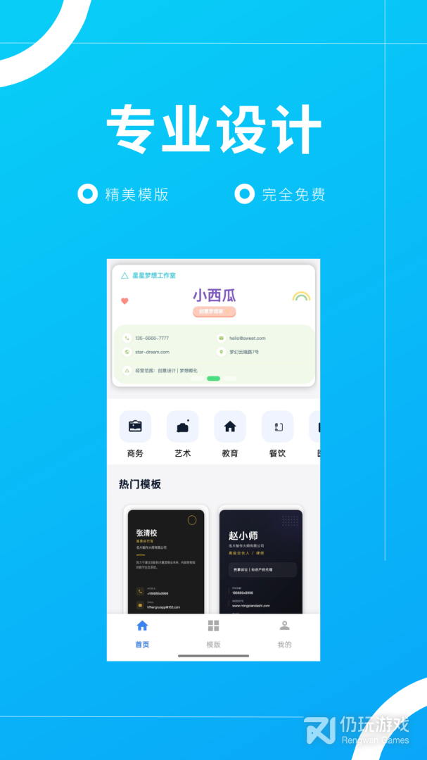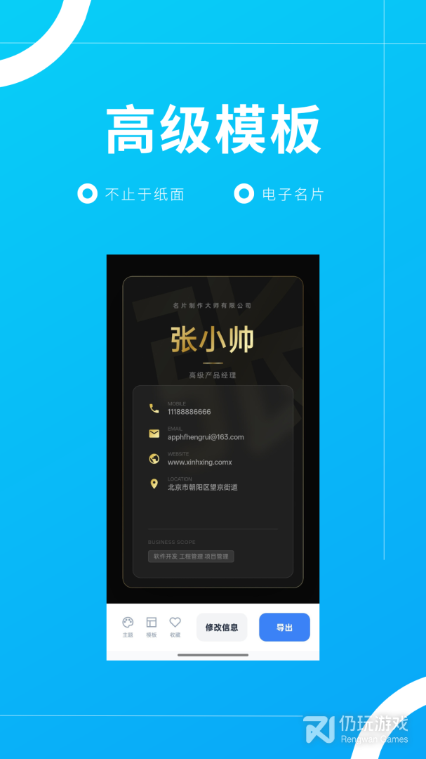 2、现如今企业的名片就想当于企业的面子,一个好一点的名片可以给公司带来更好的未来,该app有各种大师已经制作好了模板就等着你下载使用,还等什么呢,赶紧前来下载吧