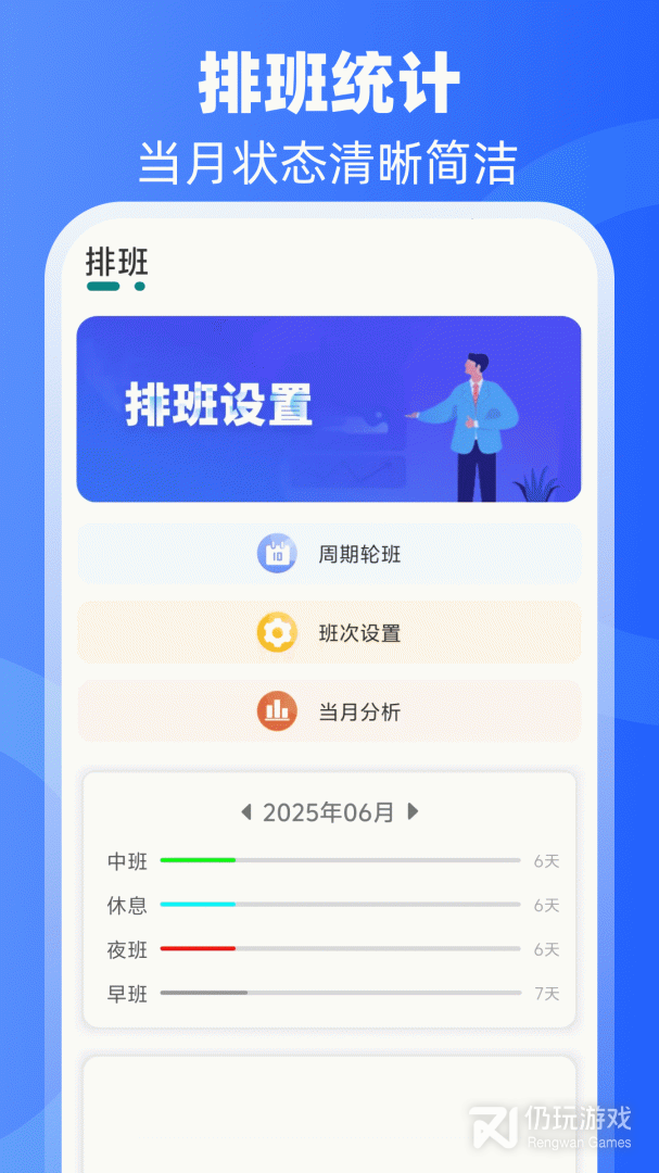周期和手动两种排班方式,分别针对周期固定和不固定的工作人群;操作流程简单,可根据一个周期的工作安排自动生成专属工作班表