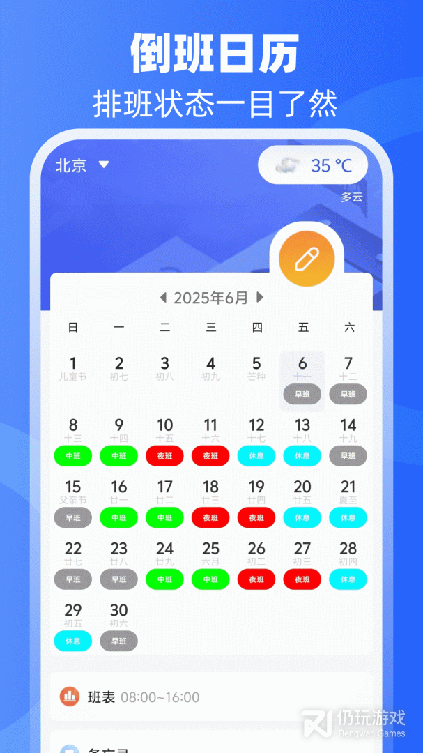 1、倒班日历下载,一款专为需要倒班的人员打造的时间管理助手,在倒班日历轻松设置倒班数据尽可以轻松获得排版表,更有温馨提醒,有需要就来下载