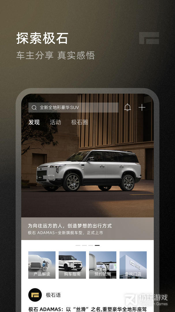 3、极石汽车最新版是一个针对该品牌汽车大战的软件,大家可以通过app来了解这款汽车的详细数据和资讯,可以在app内进行预约试驾,能够帮助大家购车,让大家能够更好的进行享受汽车服务,欢迎各位感兴趣的朋友们下载使用