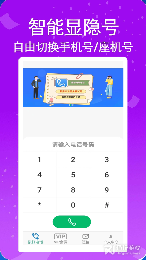 2、藏号网络电话-是真正实现多号码自由选择显示,使对方无法拦截;具备虚拟电话、匿名聊天、隐藏主叫号码、虚拟显示去电归属地、模拟来电、 自动拨号、网络高清电话功能,智能显隐号打电话可防标记突破号码黑名单,秉承15年网络电话研发技术,打造行业至低资费、加密通话功能满足您所有电话相关需求
