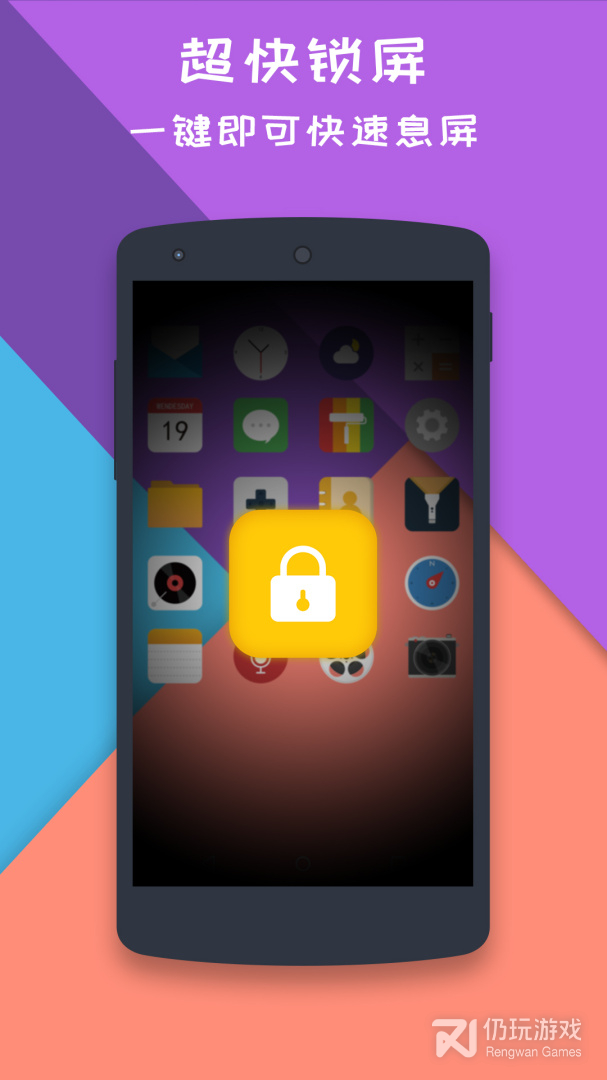 手机桌面上,点击“一键锁屏大师”图标,即可快速锁屏,减少手机电源键使用,延长其使用寿命。软件小,绿色纯净无广告,是您装机必备的实用软件。