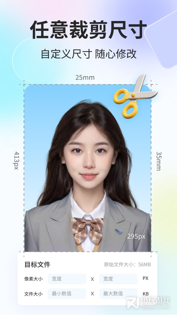 支持市面上所有的证件照尺寸,一寸、二寸、小一寸、小二寸、大一寸、五寸,如果这些基本的无法满足,还可以自定义尺寸,自定义尺寸可以按照像素或者毫米进行定义。还人性化地为用户提供场景选择,如:身份证、驾驶证、社保证、签证等证件;计算机、教资、会计、考研、公务员、英语四六级、普通话等百余种考试等。