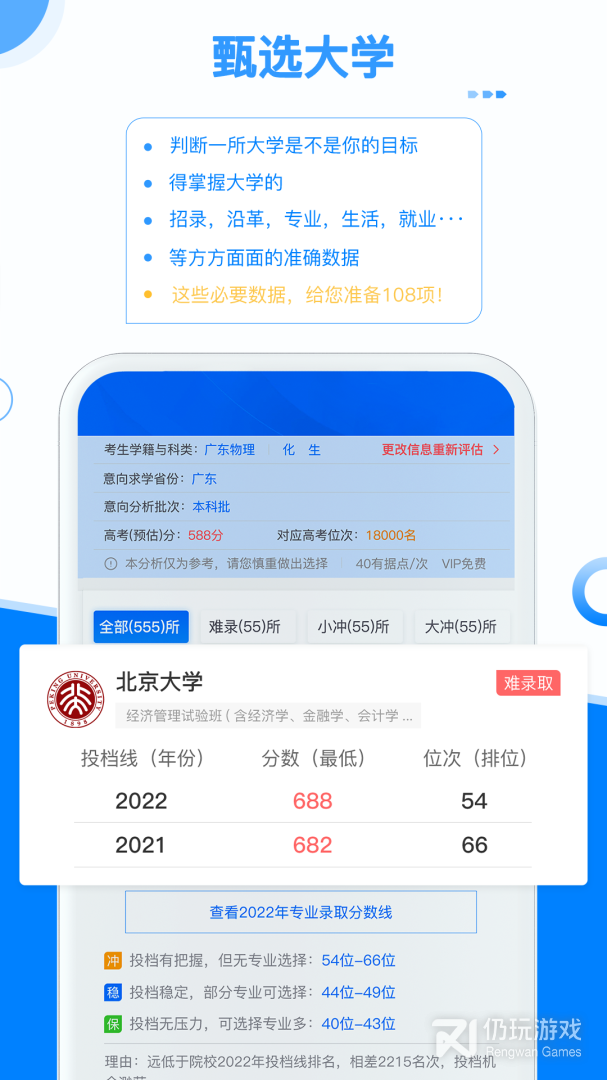 3、2019年高考录取分析:软件收录以往几年的高考数据,再通过考生的位次对其考大学的难度进行智能评估,一共有“难录取”“小冲”“大冲”“稳定”“保底”“高分层”六个录取分析可能性,让考生清晰明白自己的目标