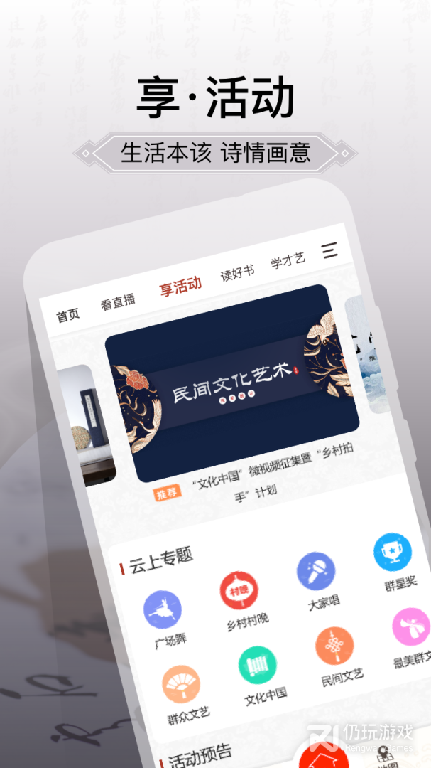 3、国家公共文化云是文化部全国公共文化发展中心官方指定公共文化宣传APP,软件现拥有共享直播、资源点播、活动预约、场馆导航、数图资源等版块,市民们掌上必备公共文化客户端,欢迎下载体验