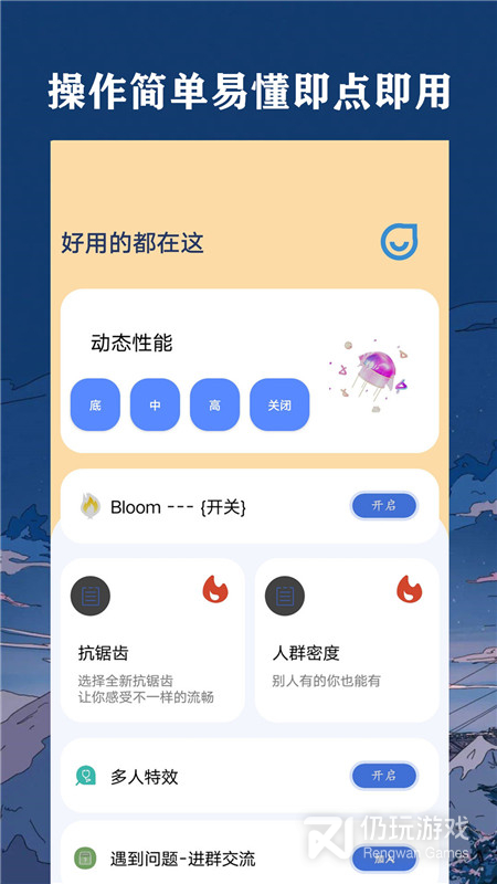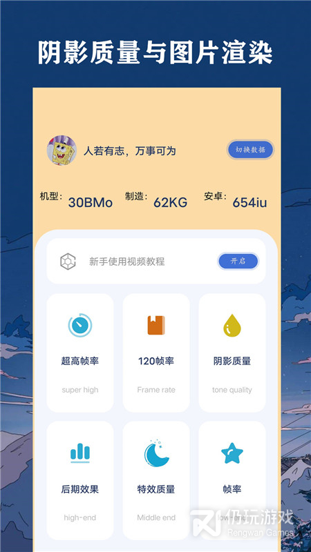 多功能帧率渲染。提供了从日常、图像质量与渲染视频帧率,阴影质量图片、后期效果等多方面的功能,操作简单,即点即用,避免您下载超多应用的难题,且应用体积轻巧,界面简洁。
