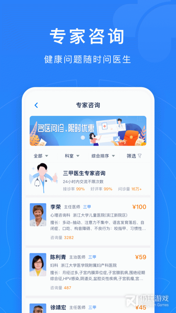 2、浙江预约挂号统一平台app是浙江医院的网上就诊平台。汇集了浙江很多家重点医院,用户可以在网上预约关于就诊咨询,方便了用户就诊,以免在医院排队浪费大量时间。如果有什么突发疾病用户还可以直接通过平台进行就诊,不会错过最佳就诊时间